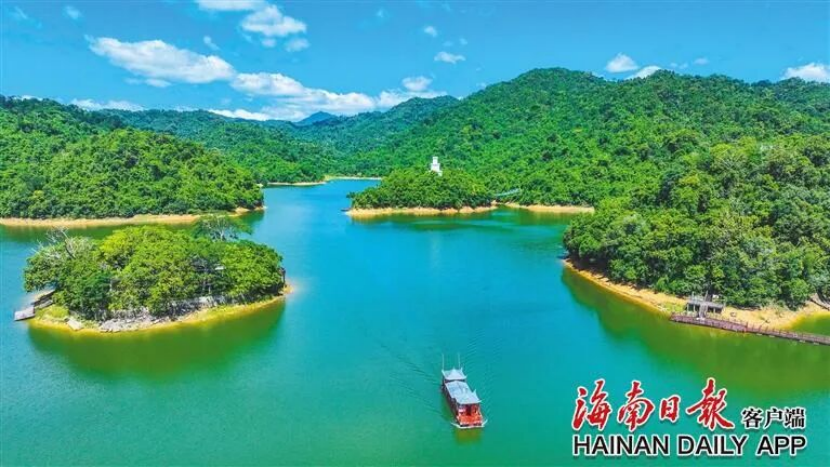 游客们乘船游览位于保亭黎族苗族自治县的神玉岛,青山绿水宛如一幅天然画卷。海南日报全媒体记者 张茂 摄