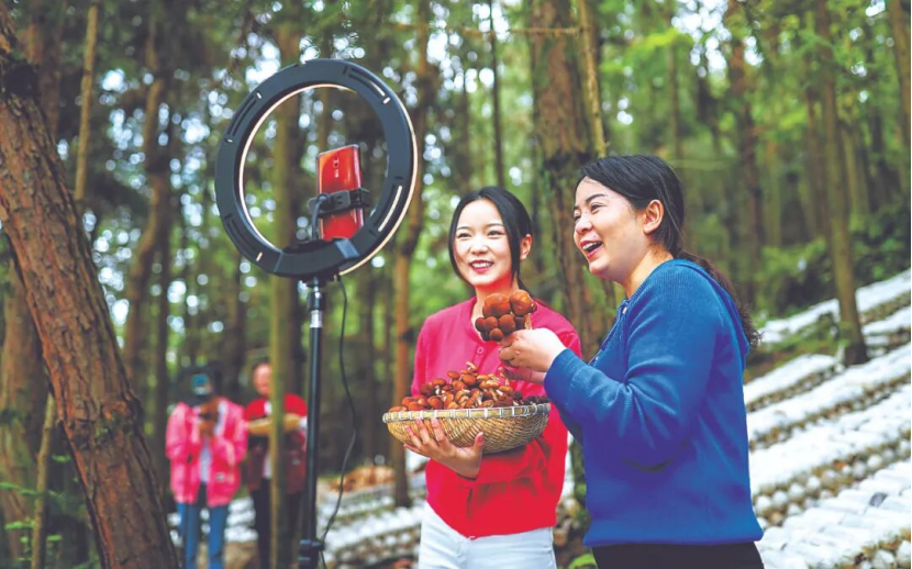 林下经济开启绿色财富密码,成为乡村振兴新亮点。贵州省黔东南苗族侗族自治州岑巩县平庄镇后坪村,志愿者在林下菌菇种植基地直播带货(胡攀学 摄)